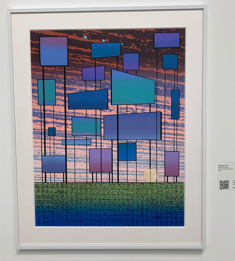 Many of the printmakers featured in this show are working artists and printmaking teachers including Nick Ruth from Hobart William & Smith College. Nick has been working with this kind of imagery for a while – his print has a grouping of billboard-like sculptural elements along a severe horizon but there is no overt message to find there – you have to fill in the blanks yourself!